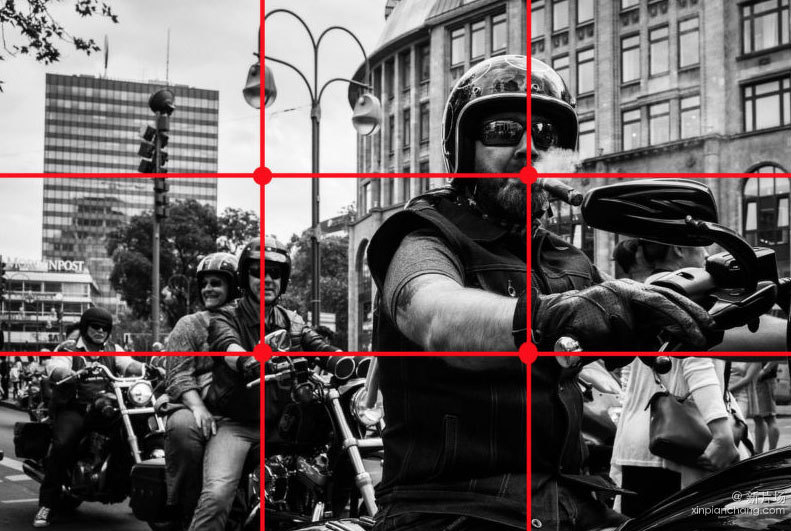 畫面中的四個點(diǎn):左上、左下、右上、右下是放置焦點(diǎn)的理想?yún)^(qū)域。在街頭攝影中,使用頂部坐標(biāo)點(diǎn)能讓畫面主題更加豐富,并聚焦。